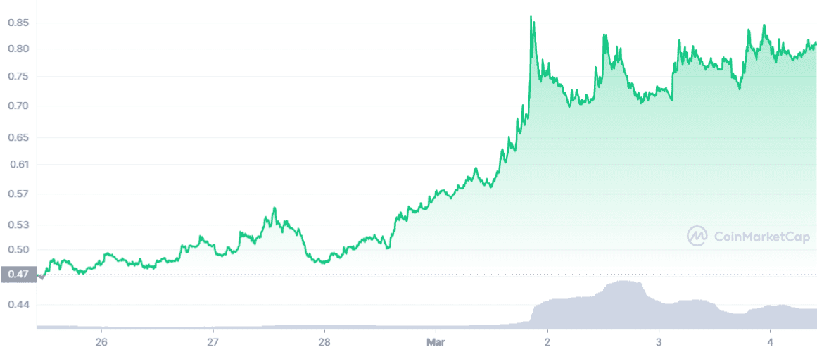 However, the massive uptrend attracted profit-seeking sentiments, resulting in a sell-off that pared gains. But, the Trust Wallet token is still up by nearly 74% on a week-to-day basis, going from Feb 26’s low of $0.478 to reach an intraday high of $0.829 on Mar 4.