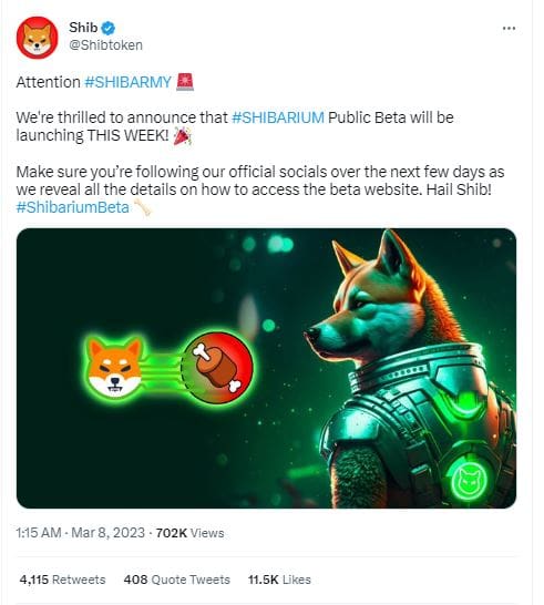 On Mar 8, the Shiba Inu official Twitter page announced that the long-anticipated Shibarium launch would commence “this week” before Sunday, Mar 12. The date is not yet certain, and the team assured its followers that they would provide more details in the coming days.