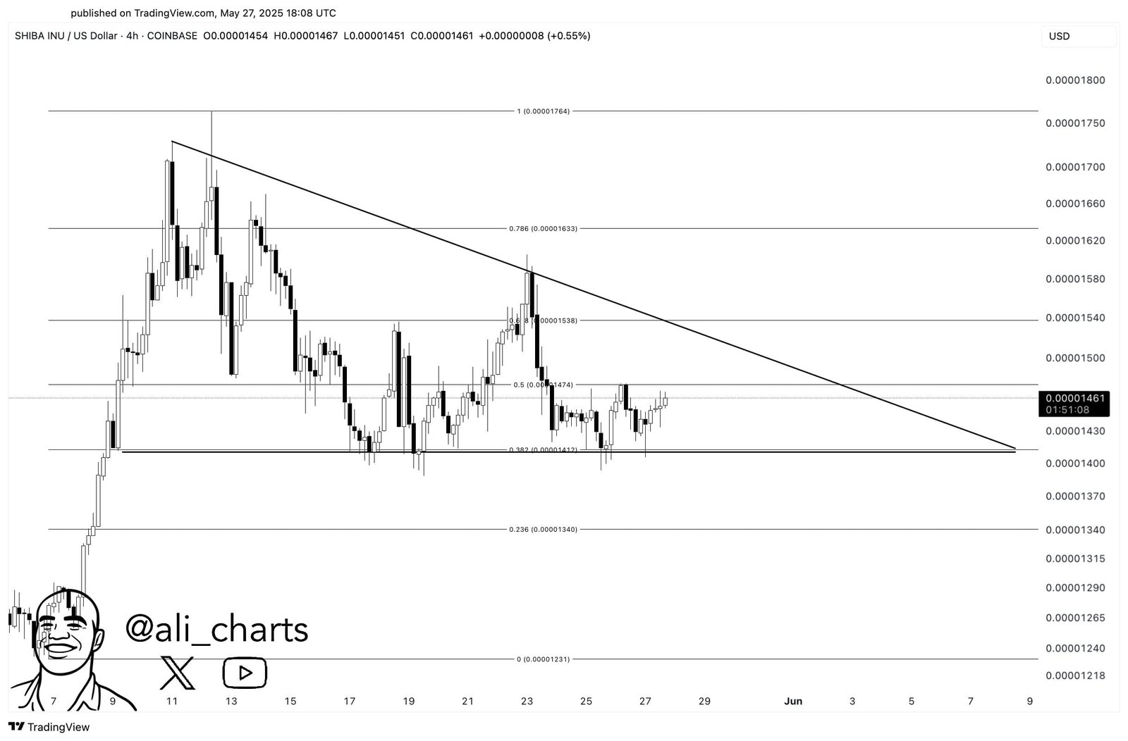 The descending triangle on the SHIB chart forms between resistance near the 0.618 Fibonacci retracement level around $0.00001538 and horizontal support close to $0.00001430. The triangle is tightening, with price compressing between the trendlines over the past two weeks.