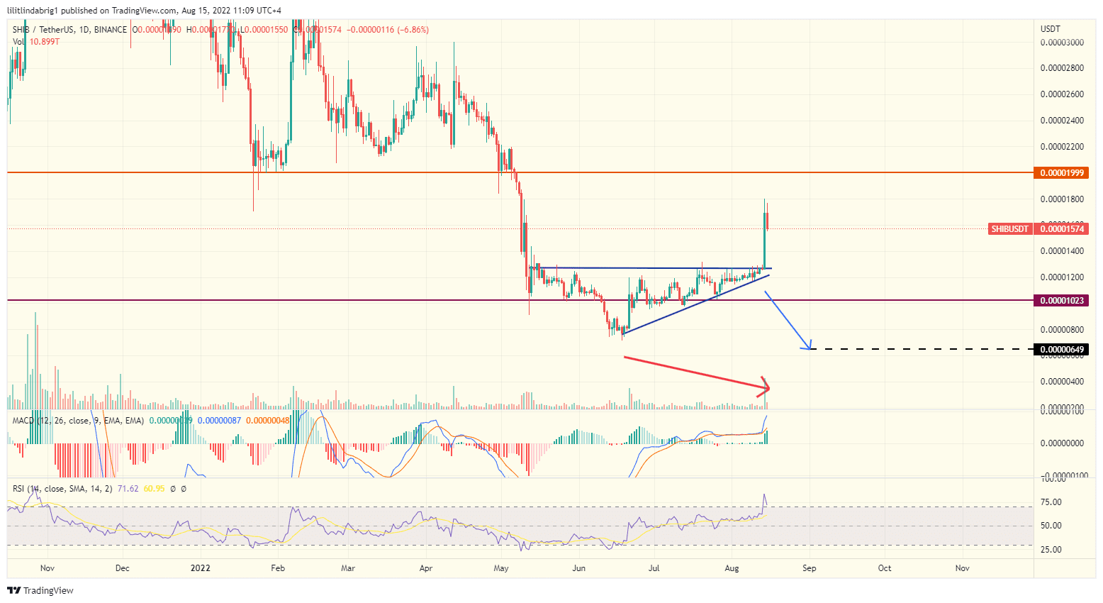 YEREVAN (CoinChapter.com) – Shiba Inu (SHIB) surged over 40% on Aug. 14, briefly peaking at $0.000018. However, the nonsense rally subsided in the following hours, as SHIB/USD settled at $0.000015 on Monday. Will the decline continue?