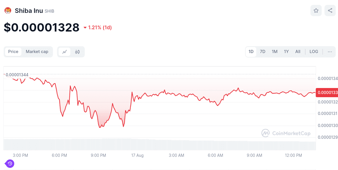 At the time of reporting, Shiba Inu coin is trading at approximately $0.00001328, down almost 1.2% in the last 24 hours.
