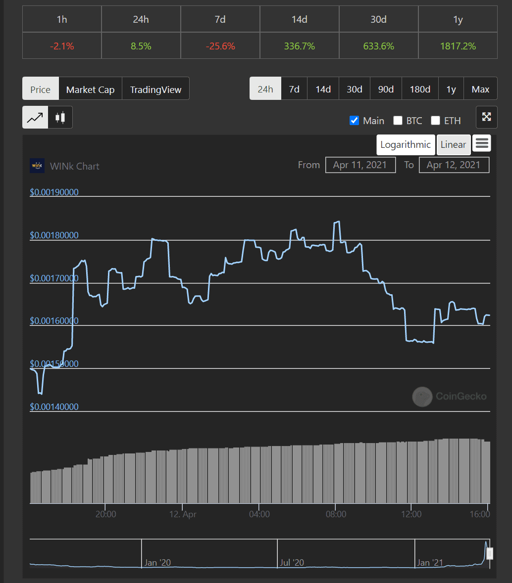 The past year is a bit unusual for WINk’s WIN token, at least in the price department. Very little had happened until late February of 2021 when the price suddenly started moving up. That uptrend culminated in a price peak of $0.00268112 on April 6th, although most of the momentum ebbed away since. Even so, WIN notes a 1,859% price increase over the past year, which is more than acceptable.