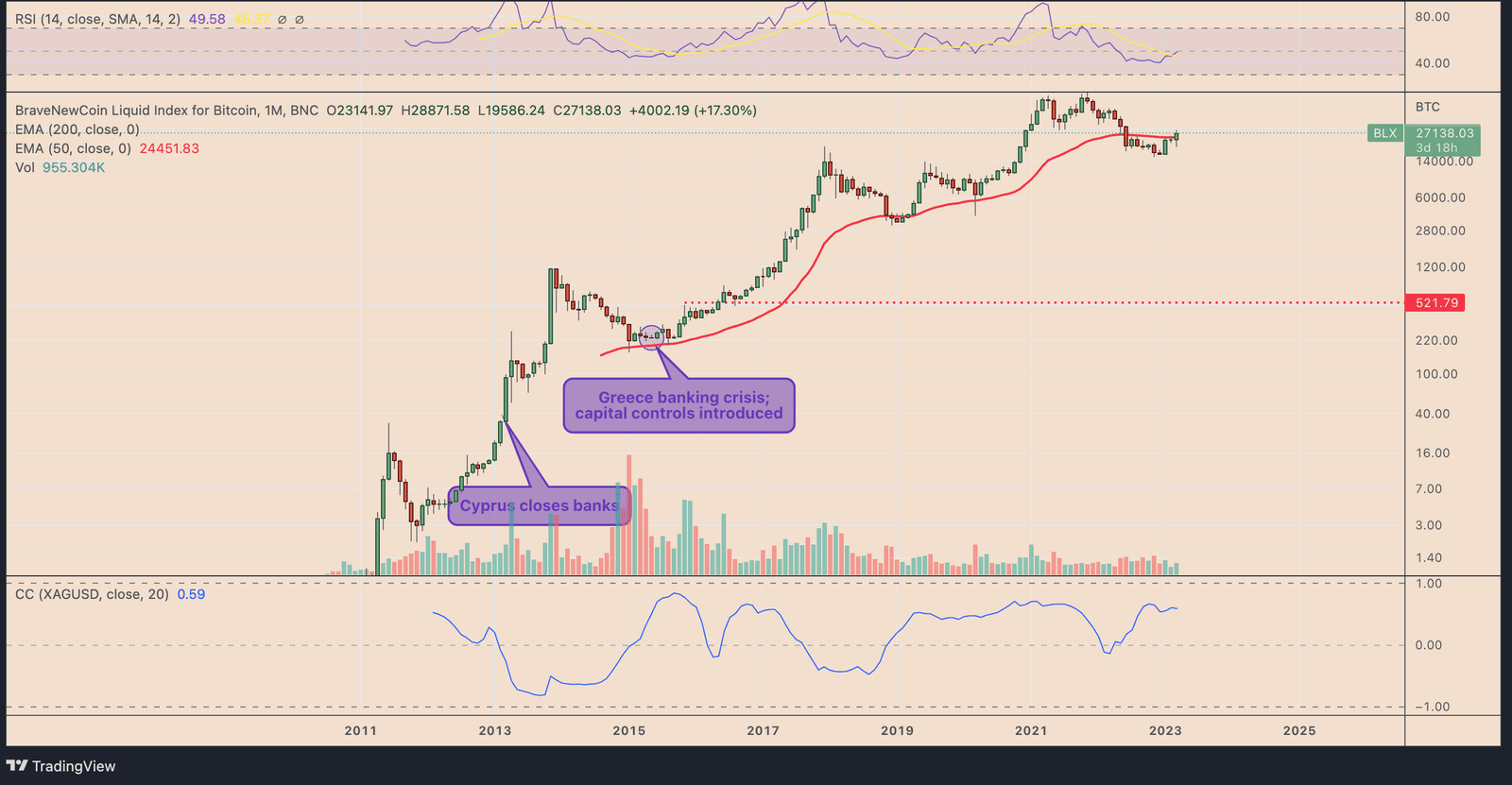 As seen in the chart below, the monthly correlation between Silver and Bitcoin was inverse during the Cyprus banking crisis of 2013. Additionally, the inverse correlation continued throughout the crisis in Greece in 2016, albeit showing signs of improvement.