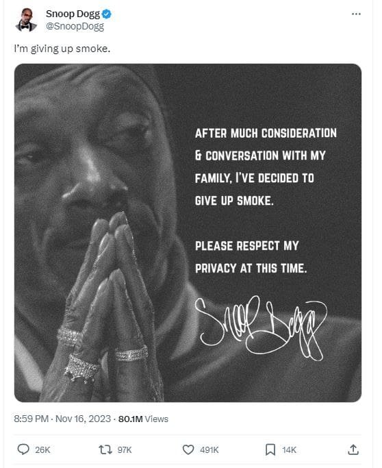 However, let’s be serious for a second. The specifics of Snoop Dogg’s announcement raise several questions. It’s unclear what he meant exactly by “giving up smoke.”