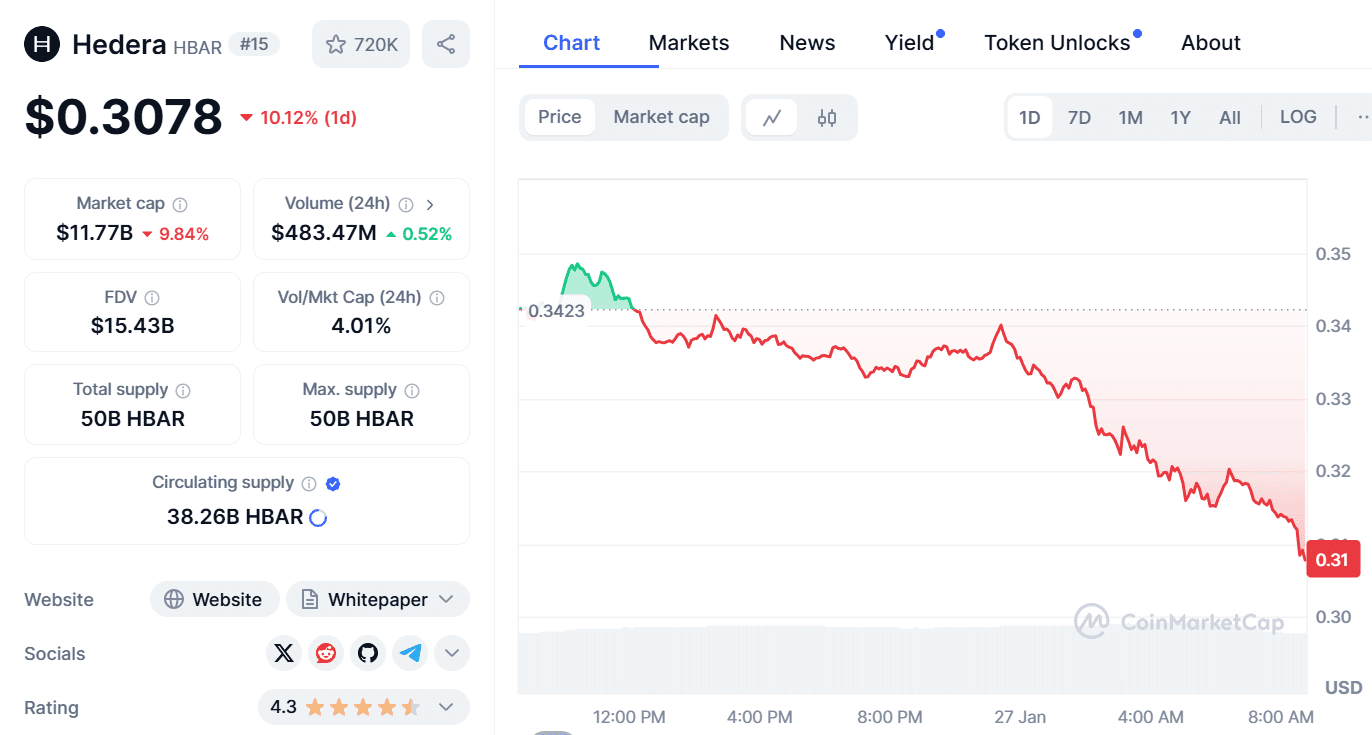 Hedera Hashgraph (HBAR) is trading at $0.3103, down 9.59% over the past 24 hours, marking a decline from its recent recovery near $0.34. To reach the $5 price target, HBAR would need a market capitalization of $250 billion, assuming its circulating supply remains unchanged.