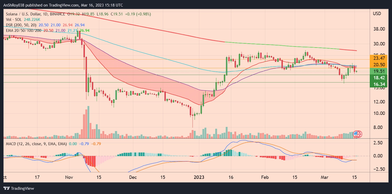 SOL price recovered slightly on Mar 16 after losing nearly 7.7% the previous day. The Solana token rose 38% since Mar 10 to form a daily high of $22.2 on Mar 14. However, a strong resistance confluence of 20-day (red wave), 50-day (purple wave), and 100-day (blue wave) rebuffed SOL’s uptrend.