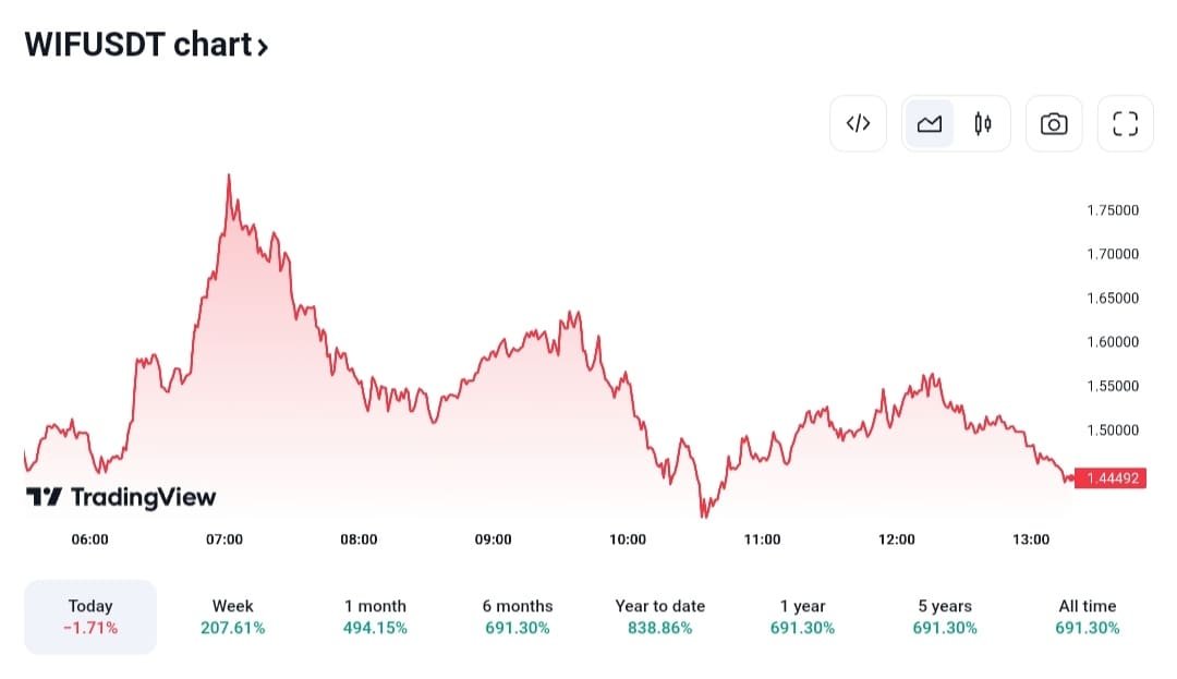 It’s a memecoin featuring a dog in a pink knitted hat. WIF reached an all-time high of $0.46 on February 14 before falling 39% to $0.28 on February 23. However, since then, WIF has rallied 571%, reaching $1.88 earlier today. However, undeterred by the temporary setback, WIF staged a 571% rally, propelling it to a staggering $1.88 earlier today.