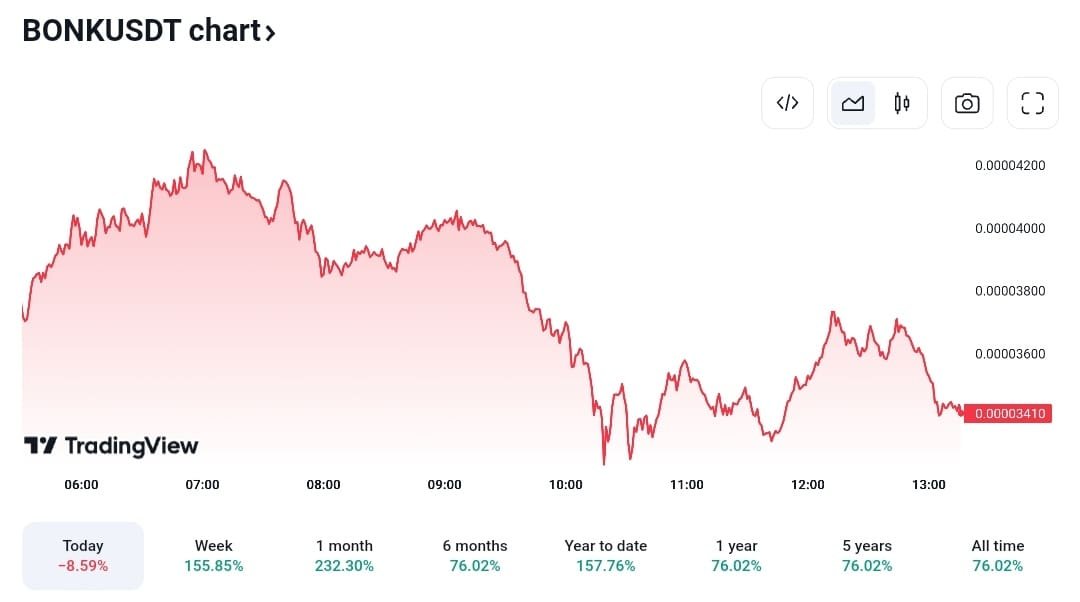 Joining the ranks of Solana’s memecoin darlings, BONK experienced a similar meteoric rise. In a single day’s trading frenzy, BONK surged 51%, reaching an all-time high of $0.000045. This remarkable feat elevated BONK’s fully diluted valuation to $3.6 billion.
