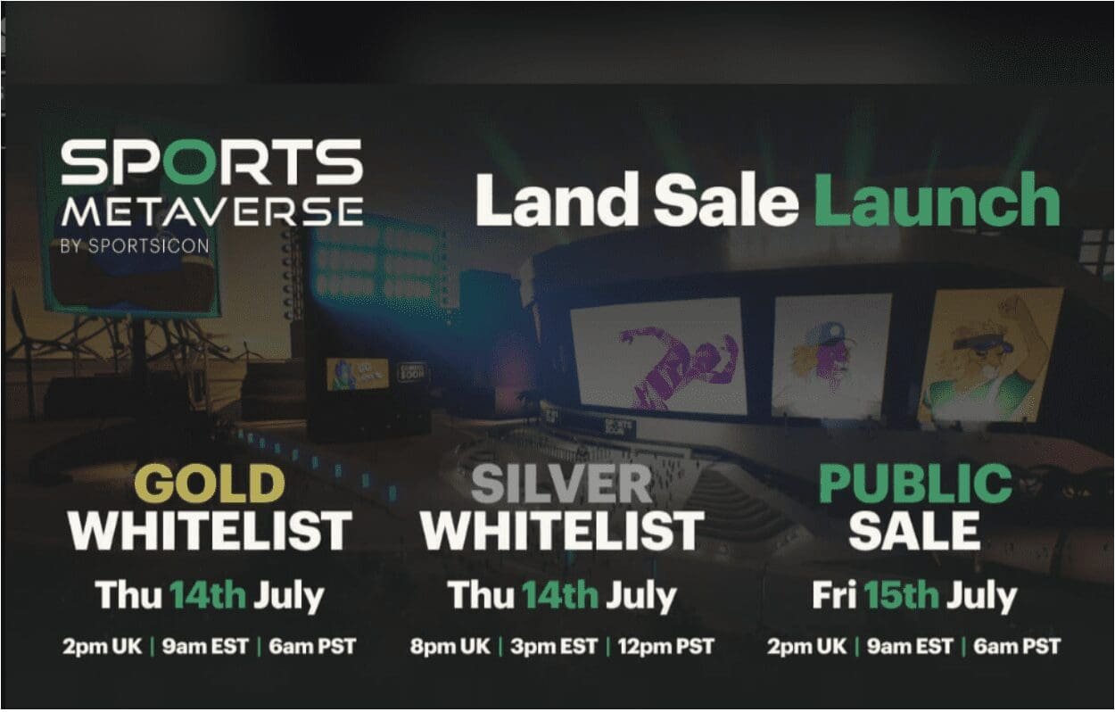 The land sale will begin in the Sports Metaverse on July 14th at 2:00 pm UK with the Gold Whitelist, and continue six hours later for the Silver Whitelist. The next day, July 15th, at 2:00 pm UK, the public sale will open to everyone. Land Purchasers will need a MetaMask wallet to buy land. Payment is in ETH.