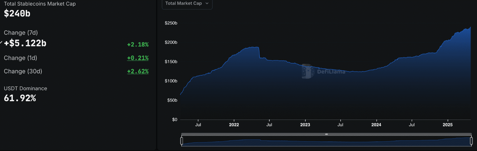 The stablecoin market cap has reached nearly $240 billion, according to DeFiLlama. This figure reflects a $5 billion increase over the past week, marking a 2.18% rise in seven days and 2.62% over the past month.