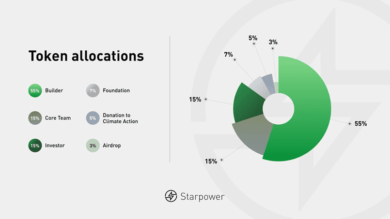 Starpower’s token distribution is organized into six key categories. Most tokens are allocated to builders for network development. The core team and investors each hold 15% of the tokens, demonstrating their commitment and supporting future expenses. The foundation receives 7% for ongoing project management, with further tokens set aside for climate action donations and community airdrops