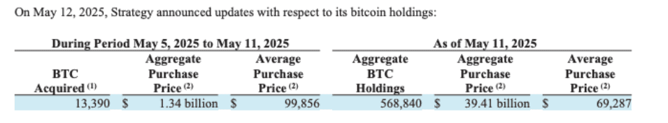 According to the company’s filing with the US Securities and Exchange Commission on May 12, Bitcoin was acquired at an average price of $99,856 per coin.