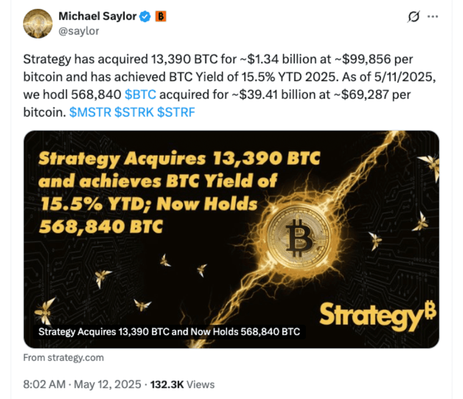 Strategy, co-founded by Michael Saylor, has made another major investment in Bitcoin by purchasing 13,390 BTC for approximately $1.34 billion between May 5 and May 11, as the cryptocurrency’s price surged past the $100,000 mark on May 8.