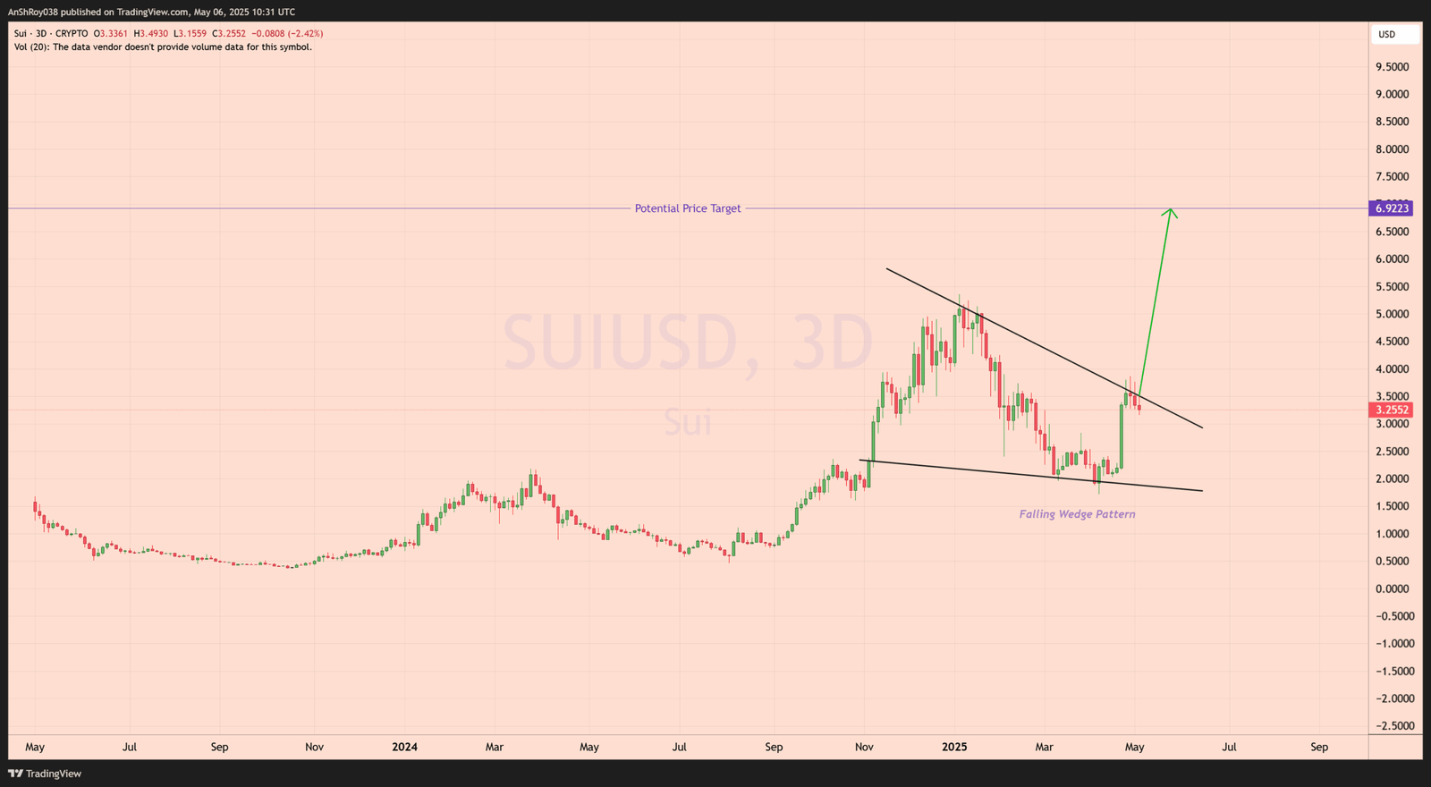 The pattern’s projected target sits near the $6.90 level, calculated by measuring the height of the wedge from its widest point and projecting it above the resistance. However, this remains theoretical until SUI breaks and holds above the wedge’s upper boundary with conviction.