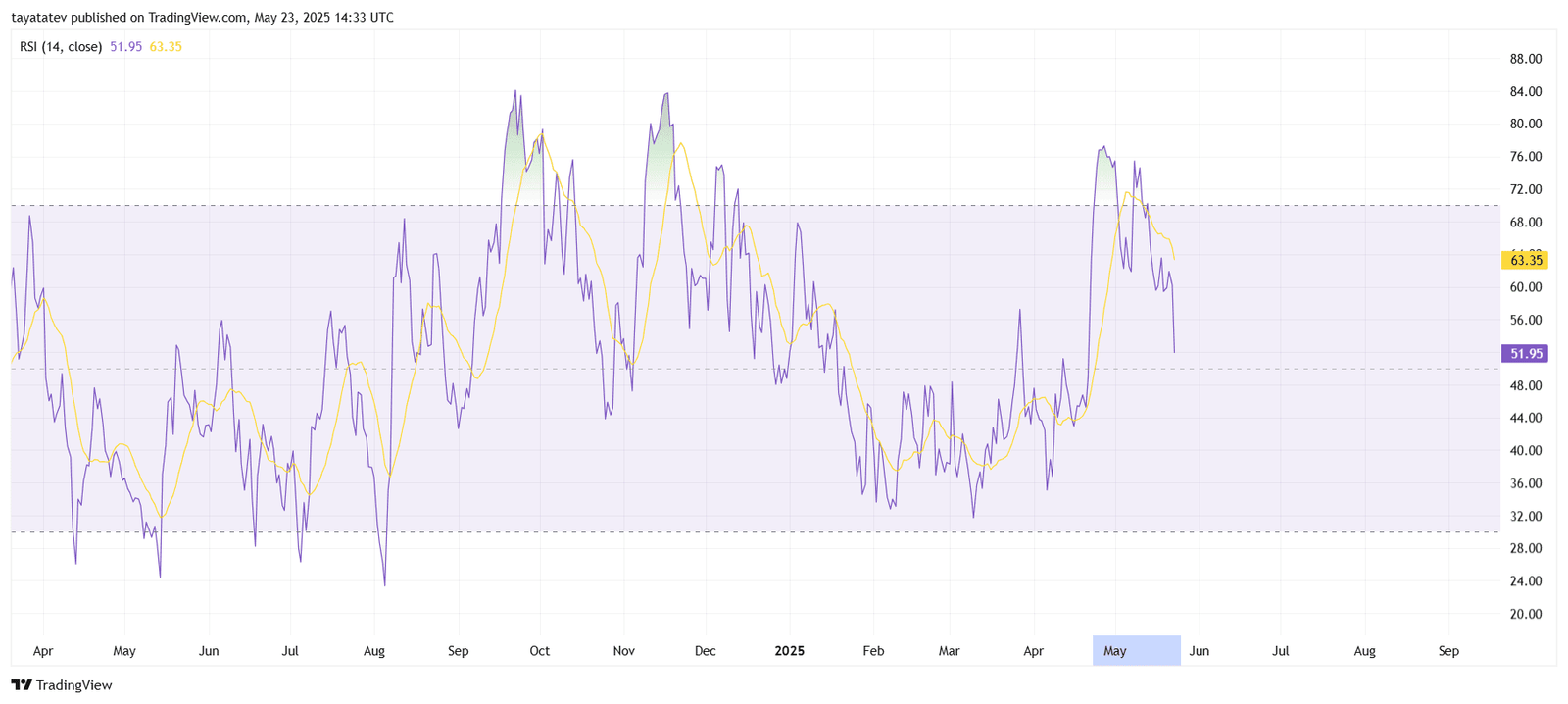 On May 23, 2025, the Relative Strength Index (RSI) for SUI/USDT fell to 51.95, based on the 14-day RSI indicator. The RSI previously peaked near 73 earlier in May, signaling overbought conditions at the time. Since then, the indicator has dropped steadily, showing weakening momentum.