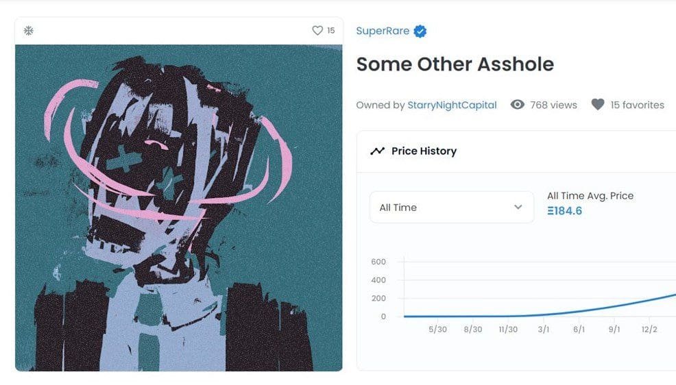StarryNightCapital, Three Arrows Capital’s NFT fund added the piece to his collection for a whopping 550 ETH, or $2.3 million. According to his page, StaryNightCapital has been amassing several NFTs, buying many of them in the past few months. The fund owns over 300 NFTs in his OpenSea account alone. Some Other A**hole is the latest from SuperRare NFT in their collection.