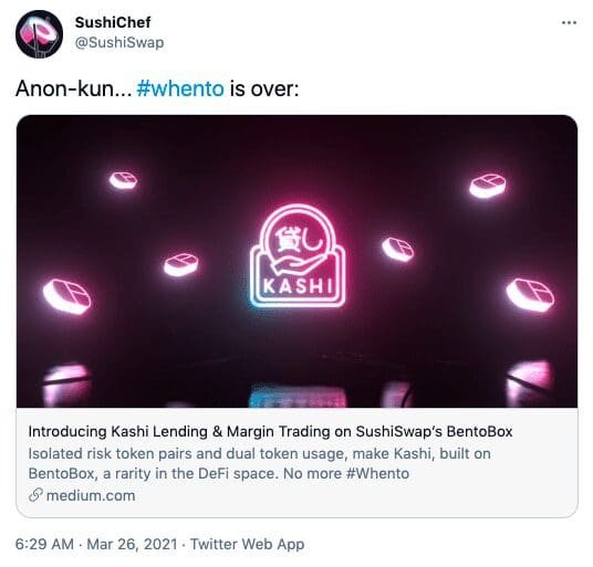 Kashi is the first margin trading platform build on BentoBox. It will allow users to borrow funds from the protocol to place bigger bets on the assets of their choice. It will also allow users to go short, or bet against, on previously inaccessible assets.