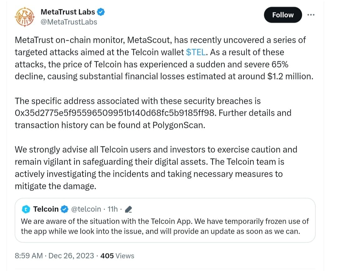 According to data tracked by PolygonScan, the theft of assets is associated with an Ethereum address identified as 0x35d2775e5f95596509951b140d68fc5b9185ff98. On Dec. 25, Telcoin abruptly suspended activities on its mobile application after users reported issues, tweeting that they were investigating problems with the app and had temporarily frozen usage.
