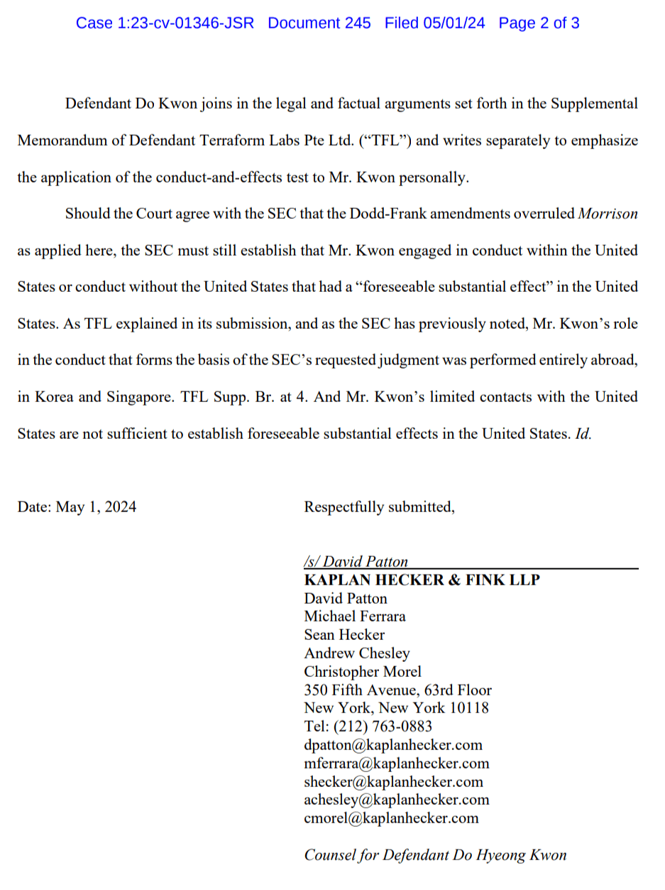 As per the May 1 filing.Terraform warned that endorsing the SEC’s penalty calculations would effectively grant the regulator unlimited global jurisdiction over cryptocurrencies. In a separate filing, lawyers for Do Kwon made similar arguments contesting whether his conduct had a “foreseeable substantial effect” on U.S. markets that would justify SEC sanctions.