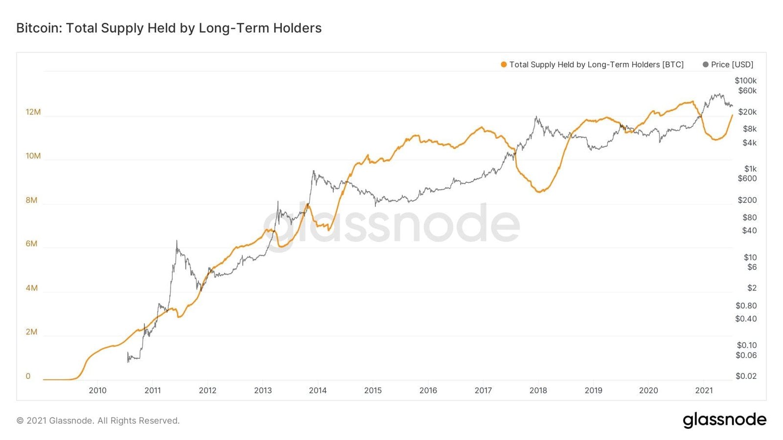According to the above Glassnode data, the total supply held by long-term BTC holders fell sharply from 12 million coins to near 10 million coins at Bitcoin’s $65,000 price peak in the last rally. Quite possibly because investors sense the top is in. Buying resumed again as the flagship cryptocurrency started slipping lower. With more than 50% plus price crash in May to sub-$30,000 levels, accumulation picked up sporadically again.