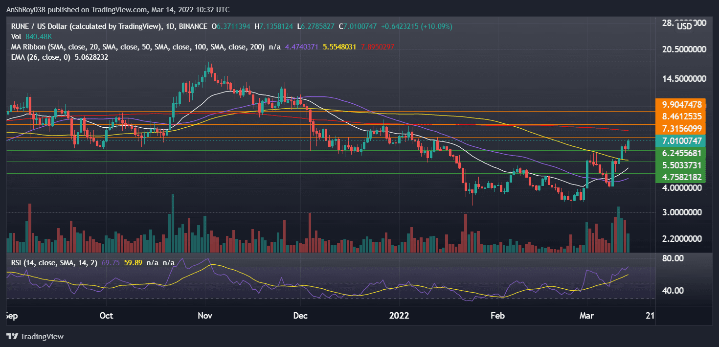 NEW DELHI (CoinChapter.com) — THORChain’s native token RUNE registered a bullish rally that saw its prices jump over 77% between Mar 8’s low ($4.031) to reach an intraday high of $7.1 on Mar 14.