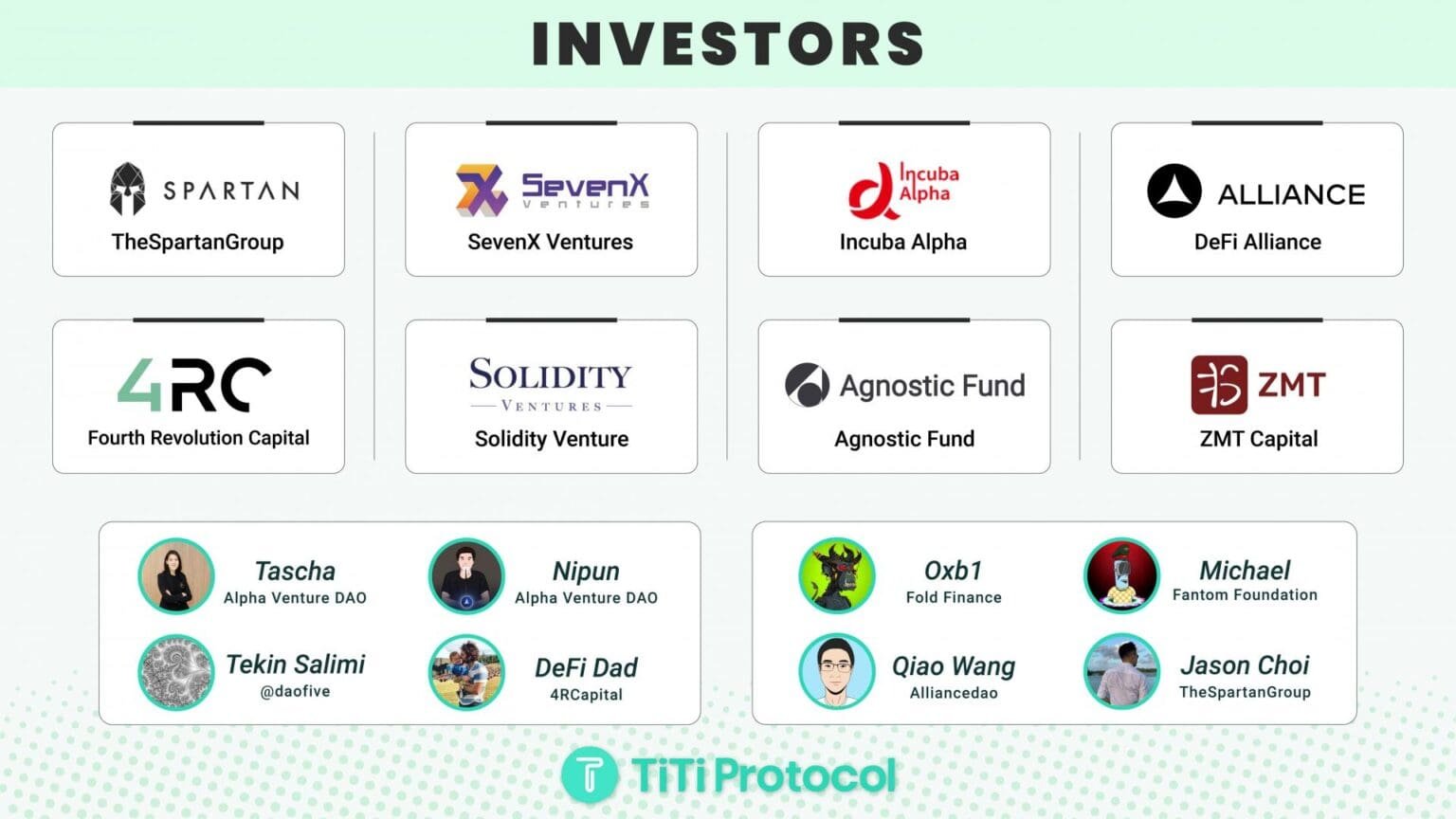 TiTi protocol announces a successful fundraising round of $3.5 million, led by Spartan Group, with participation from SevenX Ventures, Incuba Alpha, DeFi Alliance, Agnostic Fund, Fourth Revolution Capital (4RCapital), Solidity Venture, and other institutions, as well as other individual investors including 0xb1 (Fold Finance), Tascha and Nipun (Alpha Venture DAO), and Michael (Fantom Foundation). The project was incubated by Alpha Venture DAO. With this latest funding, TiTi Protocol aims to work with world-class investors to build the future of DeFi.