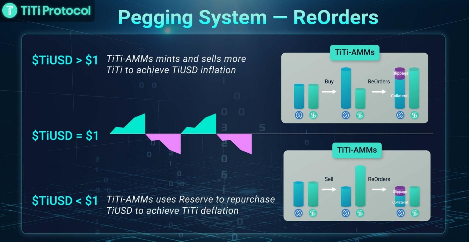 TiTi Protocol always monitors changes in the total value of reserve to calculate the average price of TiUSD in circulation and adjusts the market-making peg price of TiUSD in the primary market through the ReOrders mechanism.