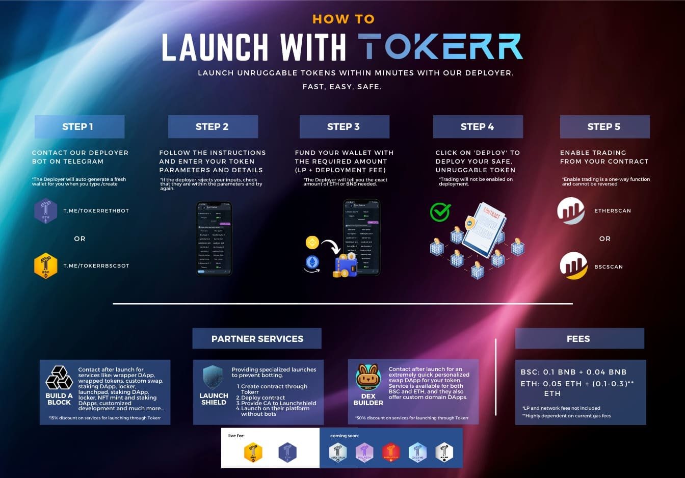 • Tokerr Deployer: The Tokerr Deployer is an easy-to-use multichain telegram bot and DApp through which users with even little or no experience of coding can launch tokens within minutes, on multiple chains. The bot is designed with hard-coded limits, so that developers cannot add malicious functions or create malicious code. The deployer has been live for Binance Smart Chain and Ethereum, with Arbitrum, Polygon and Shibarium Deployers coming soon.