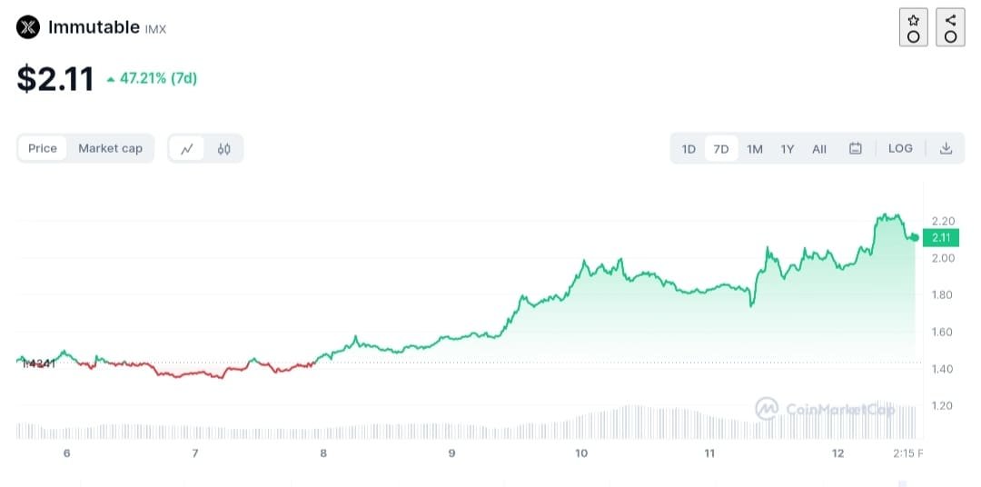 At the time of this writing, IMX’s price is $2.11 – a level last seen in May 2022. The current price of IMX is 10.19% higher than a day ago, and it shows an increase of 47.21% compared to its price a week ago.