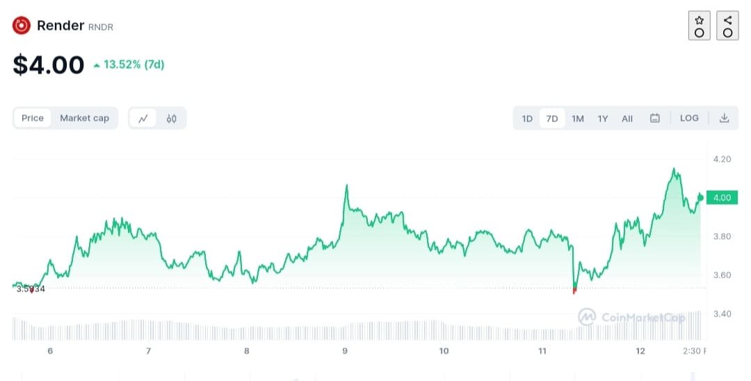 RNDR is currently trading at $4.02, showing an increase of 11.36% from a day ago and an increase of 13.49% compared to its price a week ago.