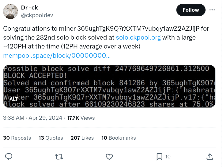 Con Kolivas, a software engineer and administrator at ckpool, a solo mining pool, announced this milestone on X (formerly Twitter). According to Kolivas, this solo miner solved block 841,286, marking the 282nd time in Bitcoin’s history.