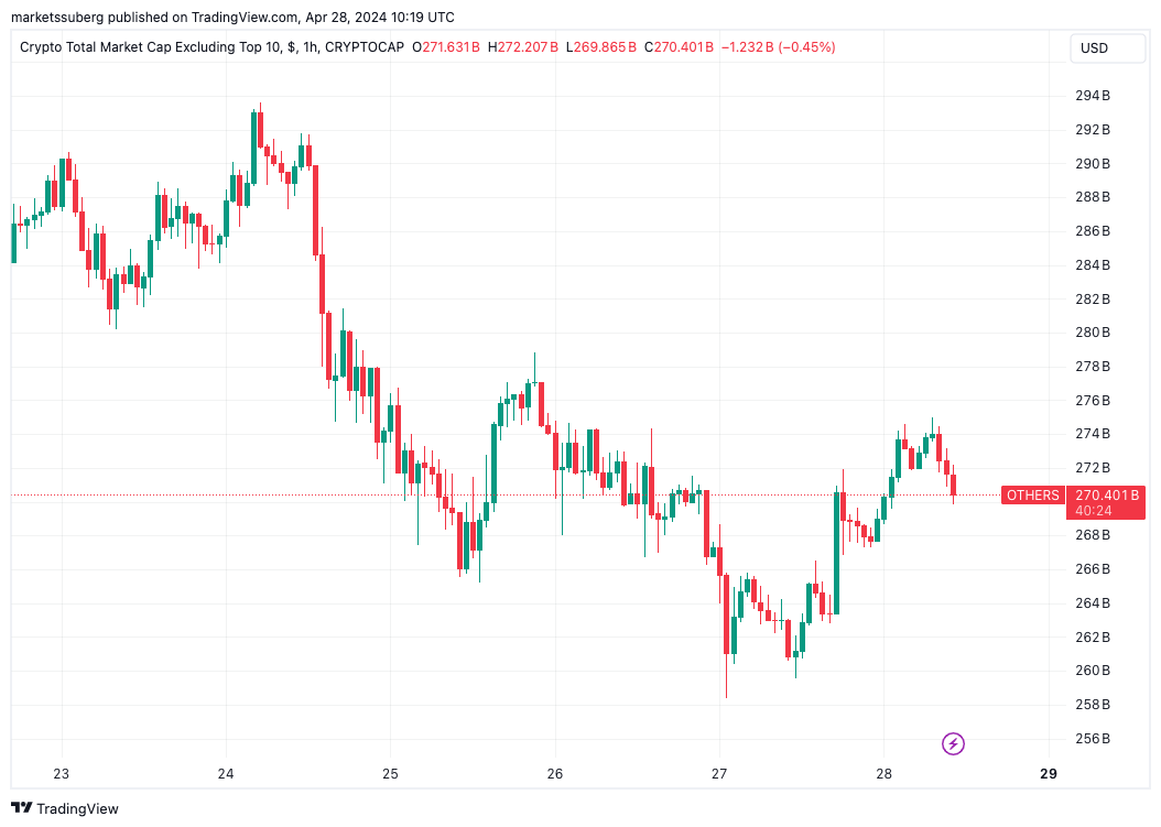 Over the weekend, Bitcoin rallied past the $64,000 mark ahead of the April 28 weekly close, while altcoins sought to recover lost ground. BTC/USD pair maintained higher ground around $63,500 after hitting weekly lows of $62,400. Notably, the total altcoin market capitalization increased by approximately 1% on the day, fueling hopes of a potential ‘altseason.’