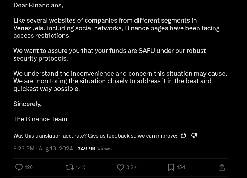 Binance assured users that funds remain safe and recommended using a VPN to bypass restrictions. The block follows President Nicolas Maduro’s order to ban X for ten days.