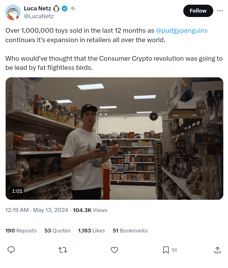 The Pudgy Penguins NFT project has sold over 1 million physical plushie toys in just 12 months. The project’s CEO, Luca Schnetzler, announced this success on May 13.