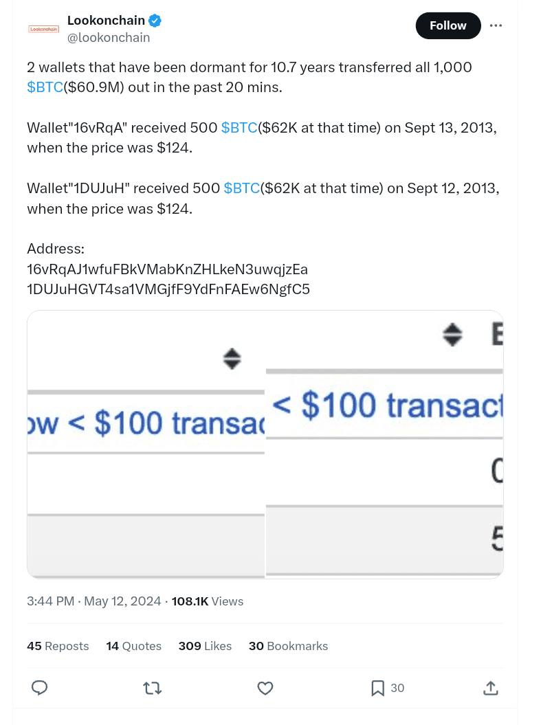 The wallet addresses “16vRq…qjzEa” and “1DUJuH…NgfC5” each transferred 500 Bitcoin on May 12 and May 13, respectively. The wallets initially received their 500 Bitcoin in 2013, when the Bitcoin price was $134.
