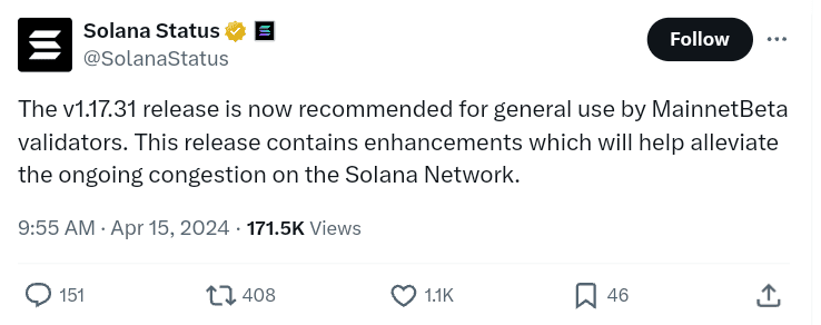 Solana developers have released a new software update, v1.17.31. This update will help tackle the persistent network congestion issues that have plagued the blockchain recently.