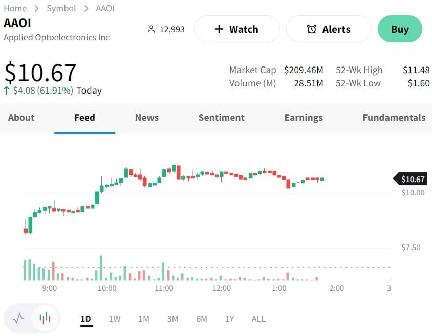 Shares of Applied Optoelectronics Inc. (NASDAQ: AAOI) soared by 65.1% in an exceptionally active trading session today. This impressive gain, the largest one-day increase since the company’s public listing in August 2018, positioned AAOI as on of the top gainers on the NASDAQ. The uptick was propelled by the optical communications product manufacturer’s upbeat outlook for the current quarter. Notably, the trading volume rocketed to over 15 million shares, dwarfing the full-day average of around 3.6 million.