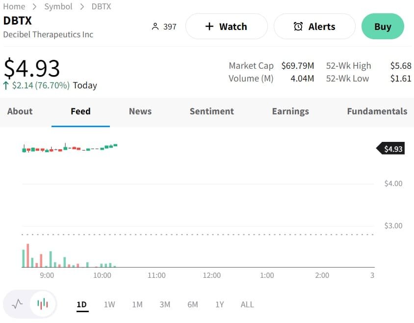 Shares of Decibel Therapeutics Inc. (NASDAQ: DBTX) experienced a big jump, soaring over 76% in trading today.