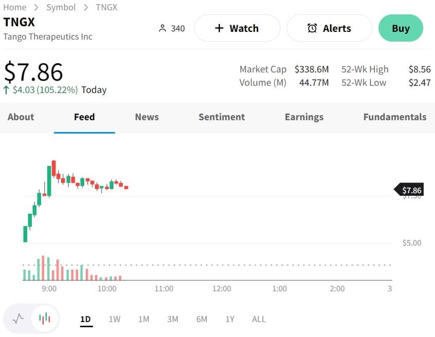 Tango Therapeutics Inc. (NASDAQ: TNGX) stock had a significant surge today, with an increase of 105%. This substantial uptick comes on the back of revised price targets from two notable financial analysis firms.