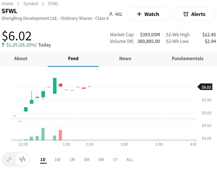 Shengfeng Development Ltd. (NASDAQ: SFWL), a prominent entity in the logistics sector, operates through its various subsidiaries to offer contract logistics services within the People’s Republic of China. The company’s stock has demonstrated substantial growth over the past year of 12.9%. Investors pushed the stock up over 26% today.