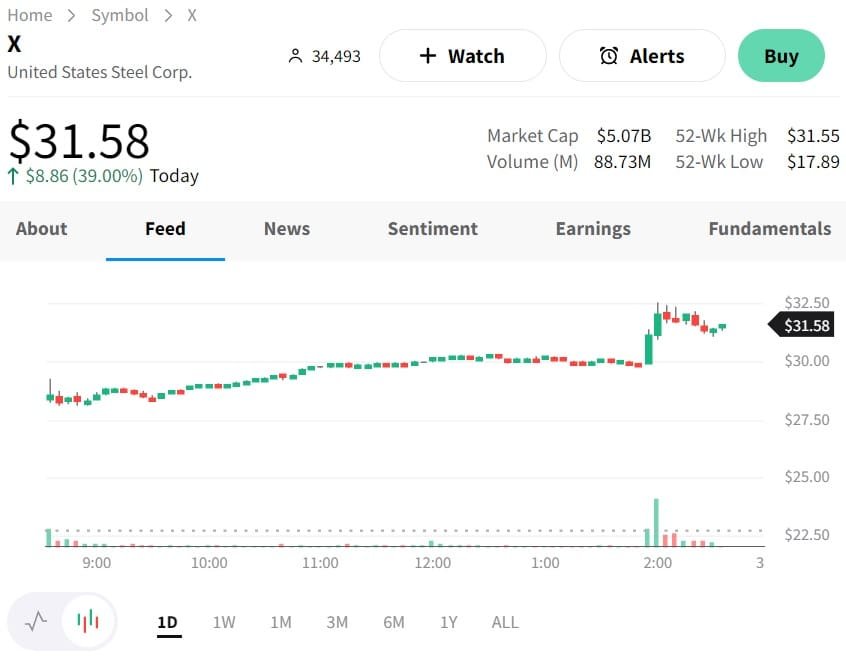 In a strategic move to consolidate its position in the steel industry, Esmark Inc., a privately held entity, announced on Monday a bid for United States Steel Corp. (NYSE: X) at $35 per share. This news triggered a significant jump in US Steel’s stock today, which climbed 39%.