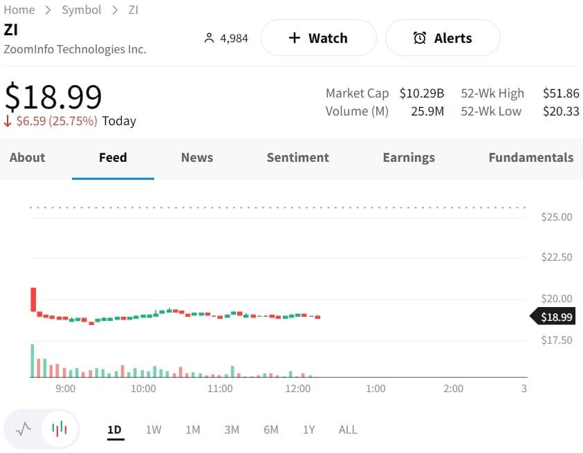Shares of ZoomInfo (NASDAQ: ZI) declined after the firm lowered its forecast for revenue, free cash flow, and earnings for the entire year. Following the news, Deutsche Bank lowered the shares to “hold” from “buy.