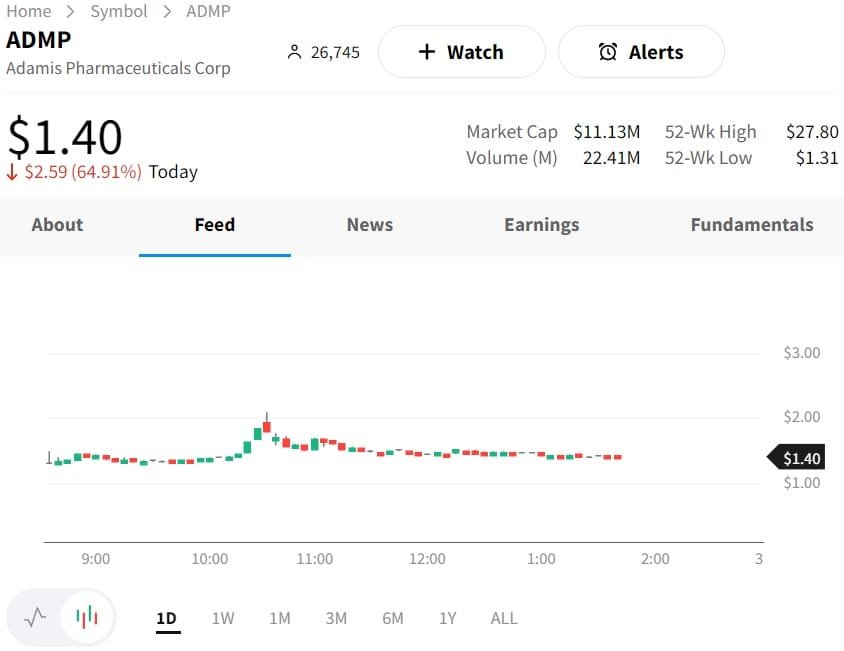 Adamis Pharmaceuticals (NASDAQ: ADMP) units fell 66% to $1.37 after the company priced its 5.9 million public offering at $1.35 per unit.