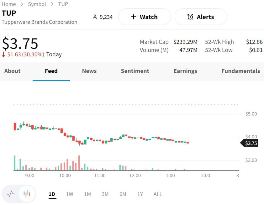 Tupperware Brands Corp. (NYSE: TUP) shares fell 18.8% in morning trade Wednesday, snapping a five-day winning streak and suffering the largest one-day drop since it fell 27.5% on May 8.