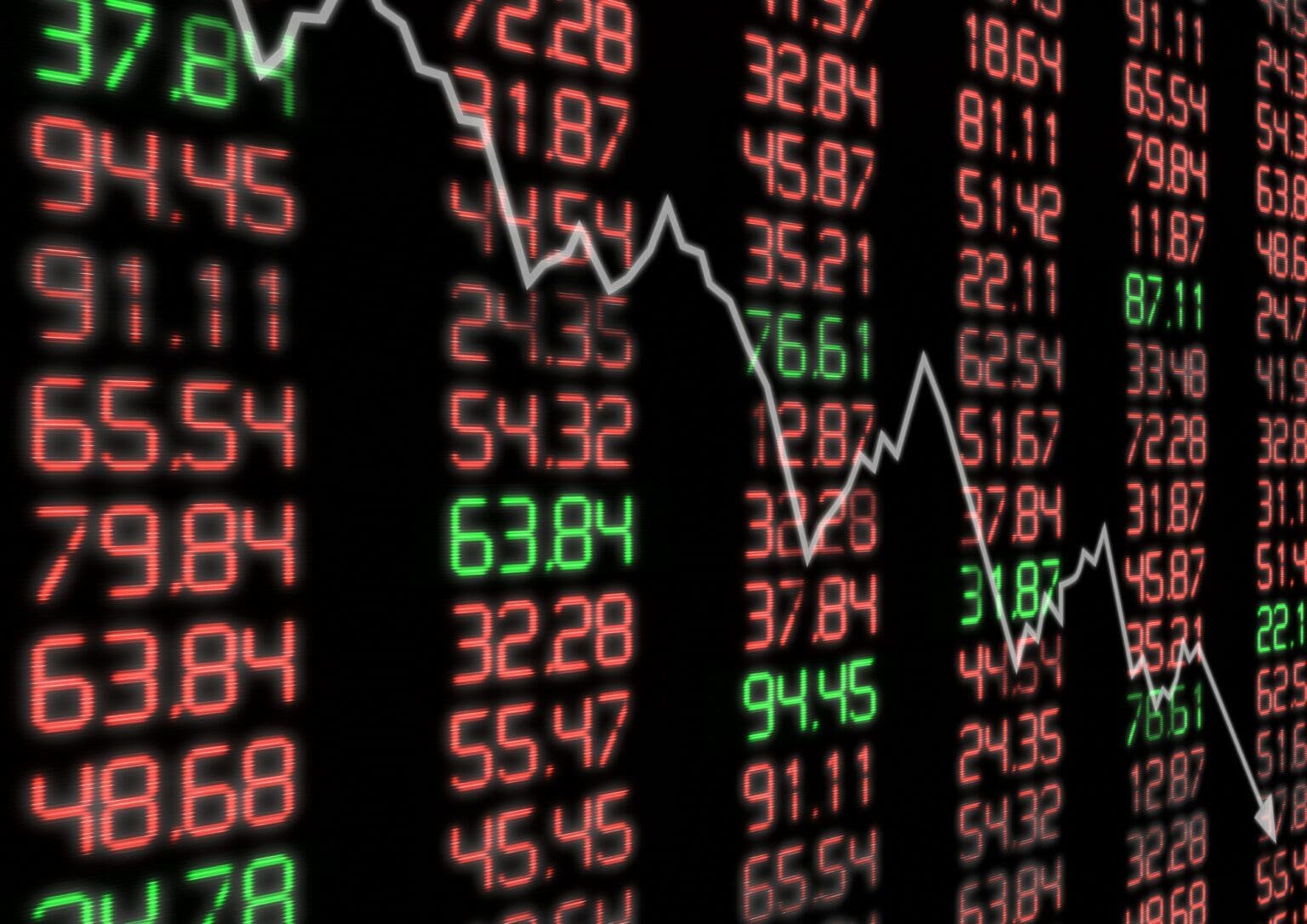 Stock Market Down – Arrow Aiming Down on Display With Red and Green Figures
