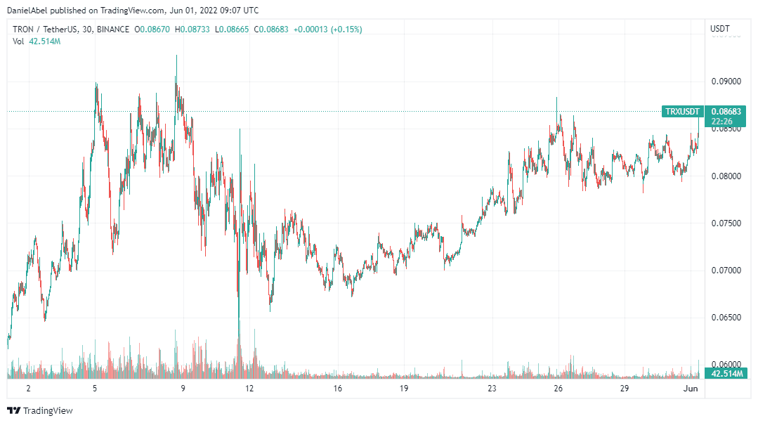 In May, Tron (TRX) is arguably the best performing digital asset as it registered tremendous growth while the entire crypto market suffered. The token in the last 30 days registered a growth of more than 20%, according to data from CoinMarketCap.