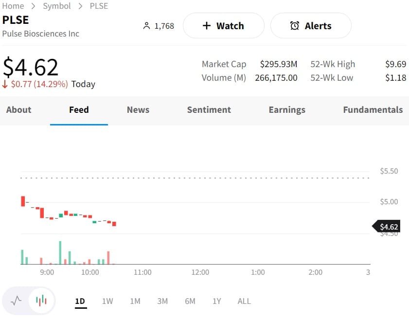 Pulse Biosciences Inc. (NASDAQ: PLSE), a firm with a focus on the utilization of its Nanosecond Pulsed Field Ablation (nsPFA) technology for the treatment of atrial fibrillation, offered no news today but experienced a sell-off of 14.29%.