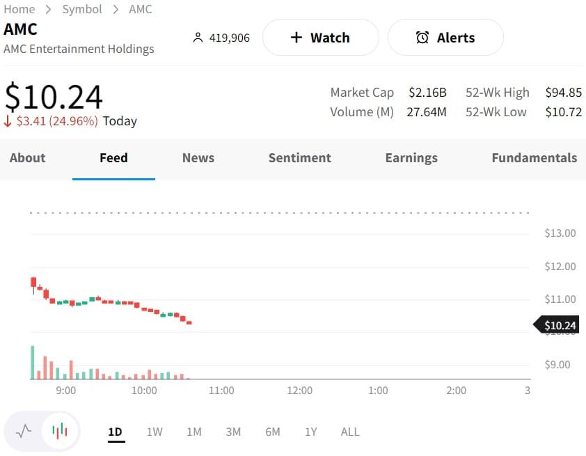 The AMC Entertainment stock plunged nearly 25% in Wednesday’s trade, with shares now valued at approximately $10.24.