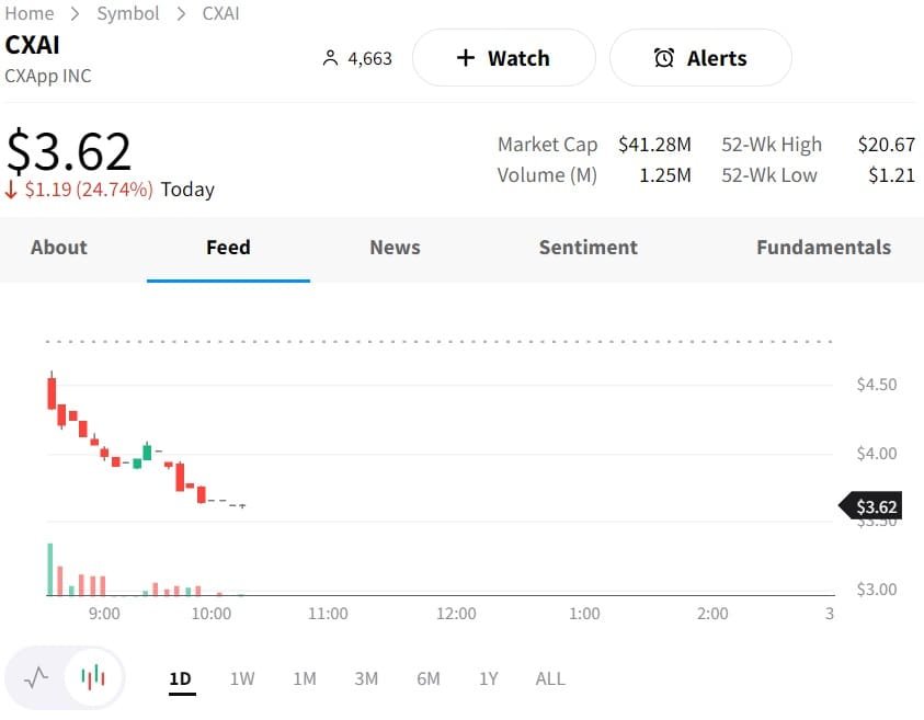 CXApp Inc. (NASDAQ: CXAI), a global technology firm, announced an advancement in its AI-based Augmented Reality (AR) solution, which did little to boost investors’ confidence in the short term, as shares sold off by 24.74% today.