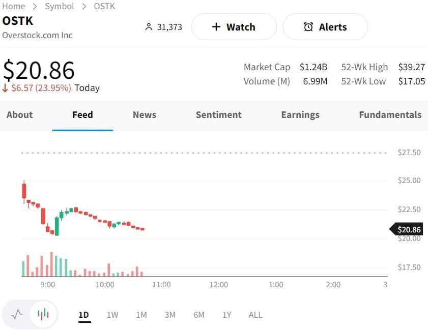 This disappointing performance has led to a fall in Overstock’s value, with shares dropping today by 23.95%.